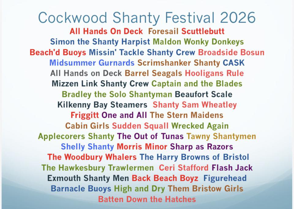 We're looking forward to our first shanty festival of 2026 - Celebrating Songs of the Sea, in Cockwood, South Devon. Detailed programme to follow - check out the event website